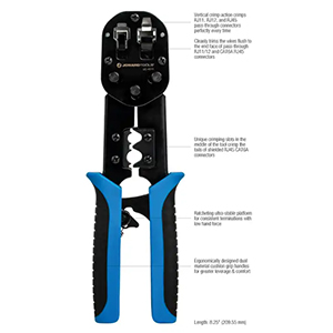 Designed to crimp RJ11/12 and RJ45 pass-through connectors with additional crimping slots for shielded connector tails, this crimping tool is perfect for any network technician working with CAT3, CAT5, CAT5e, CAT6, or CAT6A cables. This crimper also features the following: